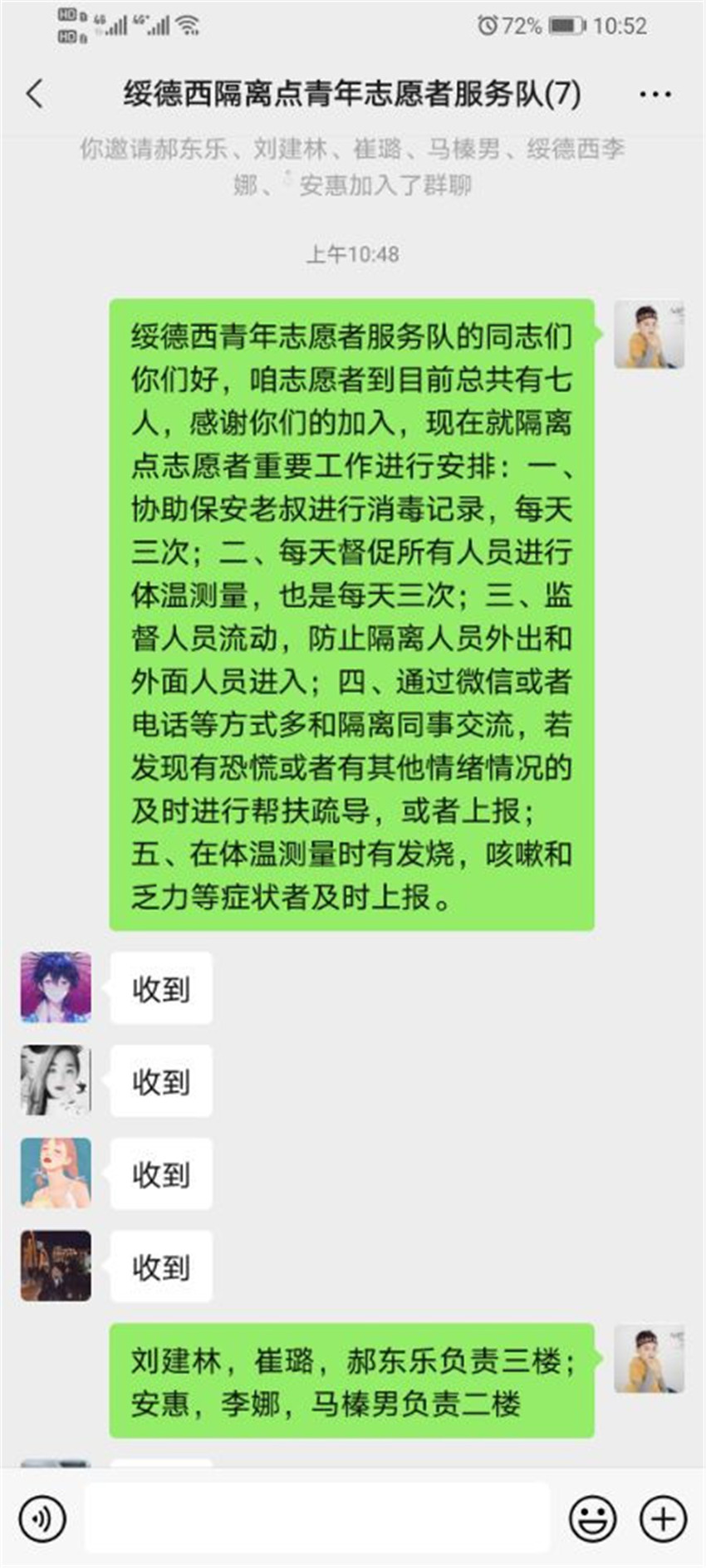 一是嚴(yán)格人員管控。每個樓層設(shè)立值班崗,對進出人員嚴(yán)格管控,有效防止人員隨意聚集,督促單位內(nèi)所有人員每天進行3次體溫測量登記。二是協(xié)助維護秩序。協(xié)助管理人員實行分批次、分桌就餐制度,引導(dǎo)站內(nèi)每桌用餐人數(shù)最多不超3人,保持間距1米。三是協(xié)助完成消殺。協(xié)助保潔保安人員完成每日3次全面消殺工作,并做好消殺記錄,及時了解各宿舍內(nèi)防疫消毒用品需求。四是開展心理輔導(dǎo)。每天在群內(nèi)通報疫情防控結(jié)果,分享新冠肺炎防控知識手冊和小常識,通過線上聊天溝通,對心理恐慌人員進行心理疏導(dǎo)。
